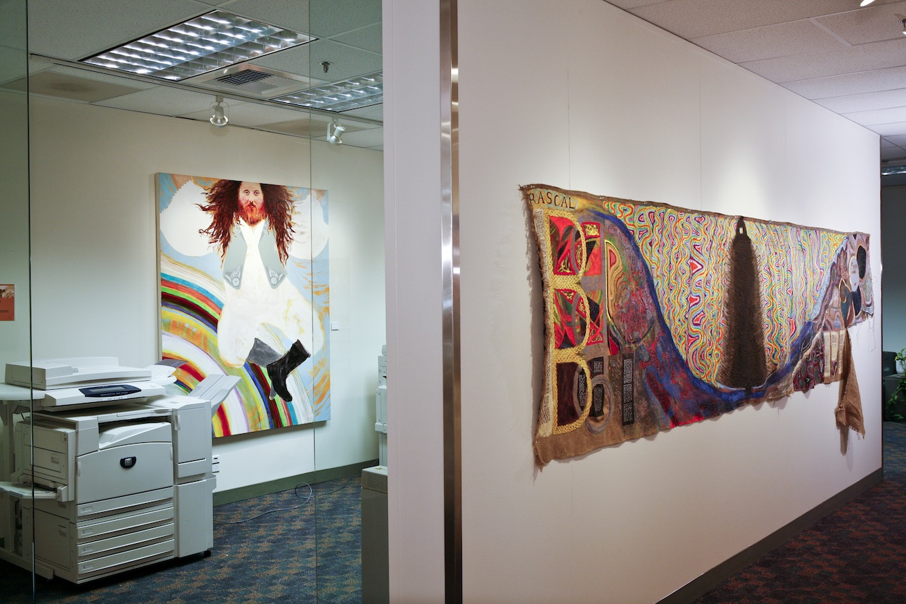 installation photo for "Object Oriented Programming," Katie Herzog's solo exhibition at PARC, a Xerox Company, on view January 13 - March 30, 2012. "Freedom (Richard Stallman Folk Dancing)," acrylic on canvas, 60 inches x 72 inches, 2008, "Psychedelic Illuminated Manuscript," acrylic, pastel, wax strings, gold leaf, on burlap, 42 inches x 180 inches, 2009