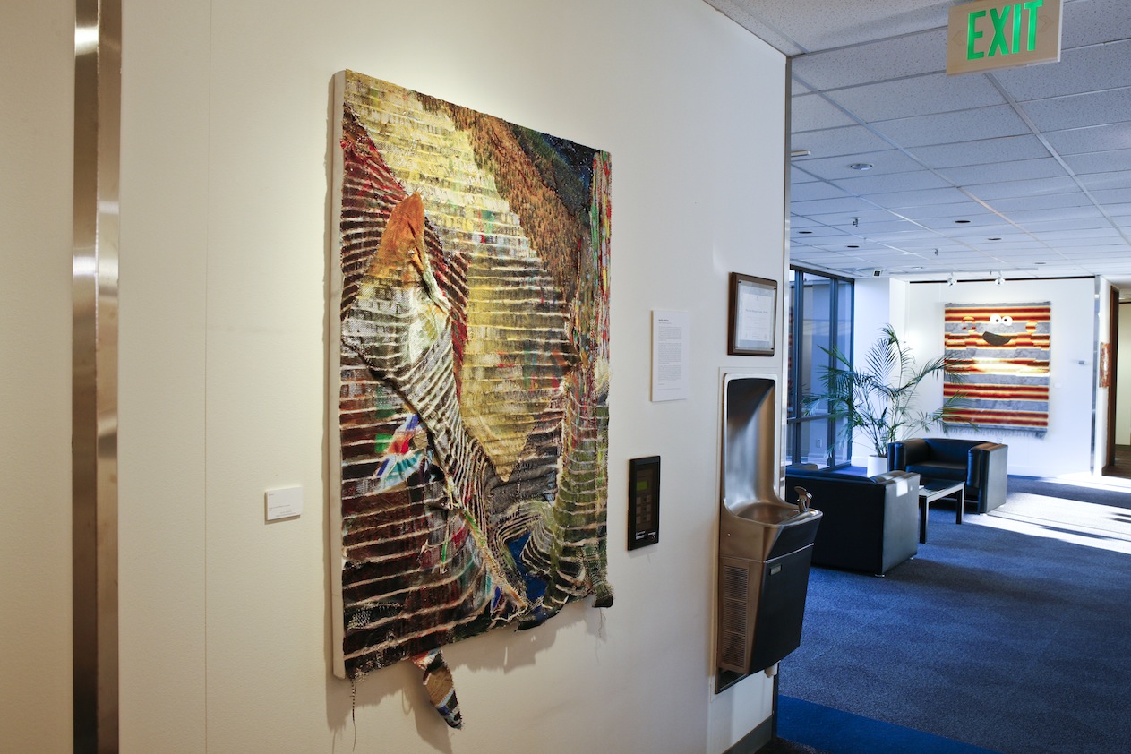 installation photo for "Object Oriented Programming," Katie Herzog's solo exhibition at PARC, a Xerox Company, on view January 13 - March 30, 2012. "Quarry," acrylic on found fabric on canvas, 36 inches x 48 inches, 2009, "C is for Cookie (PARC)," acrylic on wool blanket, 54 inches x 68 inches, 2011
