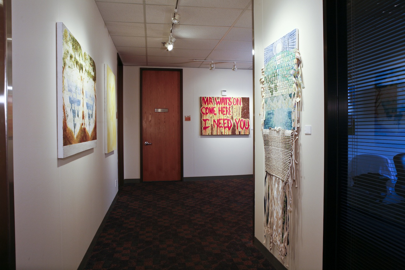 installation photo for "Object Oriented Programming," Katie Herzog's solo exhibition at PARC, a Xerox Company, on view January 13 - March 30, 2012. "Stereopticon," oil and acrylic on canvas, 36 inches x 48 inches, 2008, "Memory School Dropout," acrylic on canvas, 36 inches x 48 inches, 2010, "Mr. Watson Come Here I Need You," acrylic and garnets on canvas, 36 inches x 48 inches, 2011, "You Are Here," mixed media, 28 inches x 70 inches, 2008