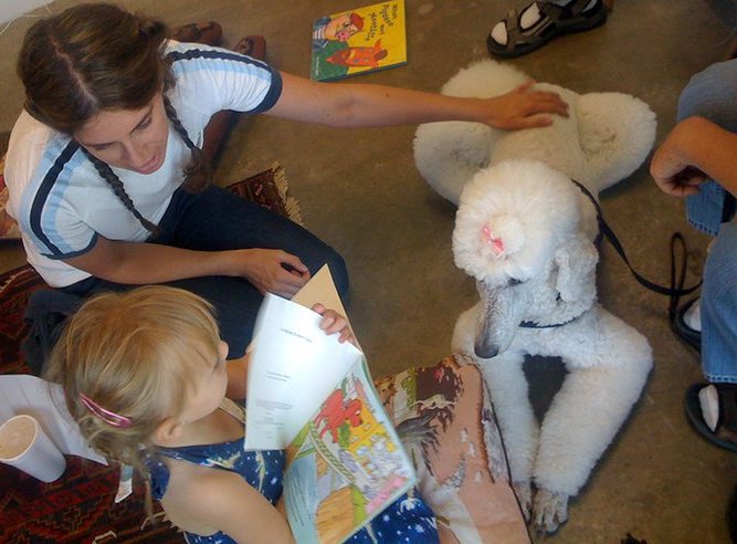 "Une Alphabétisation Autre" was the title of an animal assisted literacy event I organized in conjunction with my solo exhibition, "Informel," at Actual Size Los Angeles in 2010. Two certified therapy dogs hung out in the gallery for an afternoon, and children were provided books to read to the dogs.